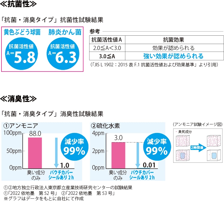 以下の通り「抗菌性」「消臭効果」が示されました。